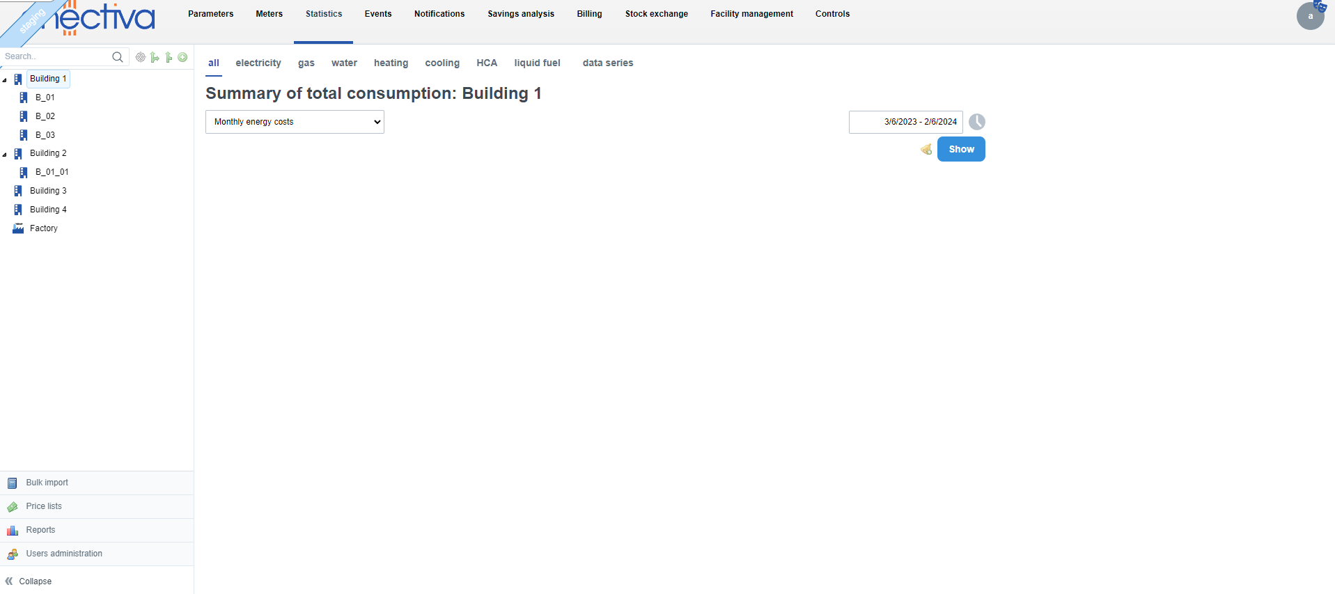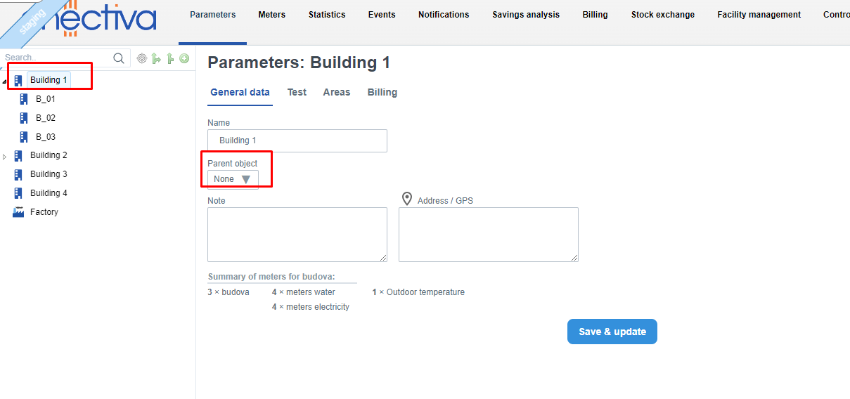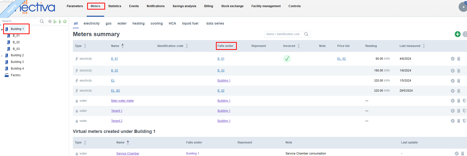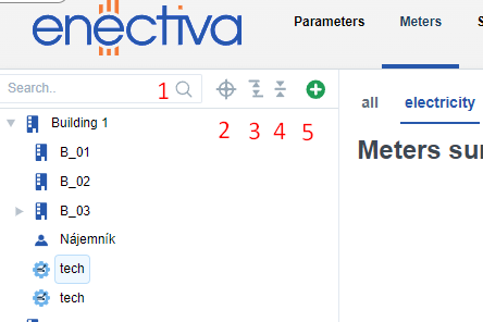 Click on individual objects in the left panel (buildings, complexes, factories, technologies, etc.) to move to the given object. Being on a certain object means that you can see all the meters that fall under that object and the objects that fall under it when you click on Meters.