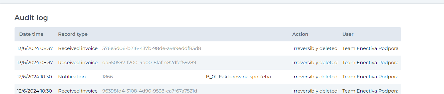 The following models appear in the Audit Log when deleted: Bulk Import (two types), Control Unit, Dashboard (deleted by removing all DCs from it), Data Series, Delivered Chart, Entity, Scheduled Export (not the exports created based on it), Export Template, Received Invoice, Meter (physical and virtual), Correction, Notification (all user-deletable types), Price List, User (admin and lower), Meter Deactivation (physical and virtual).
