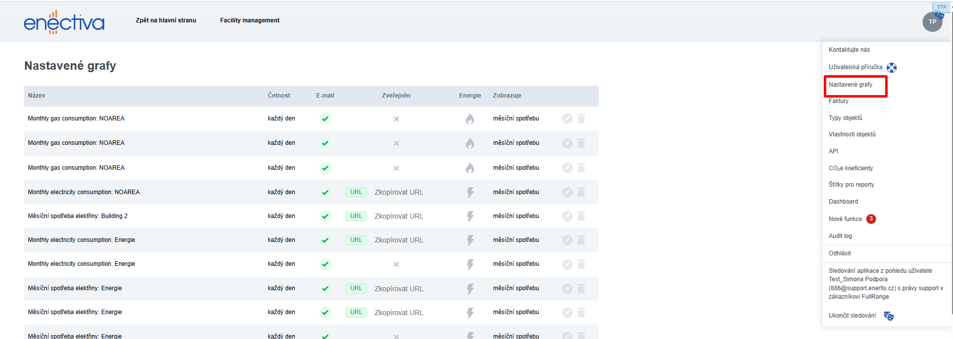 Enectiva umožňuje automaticky zasílat grafy e-mailem. Vybraný graf lze také zveřejnit pomocí odkazu – ten lze sdílet i s osobami bez přístupu do aplikace.