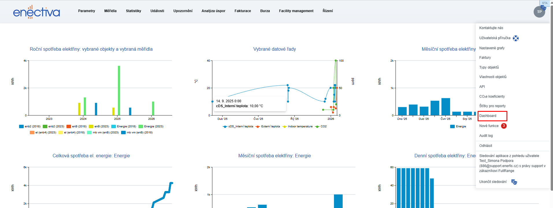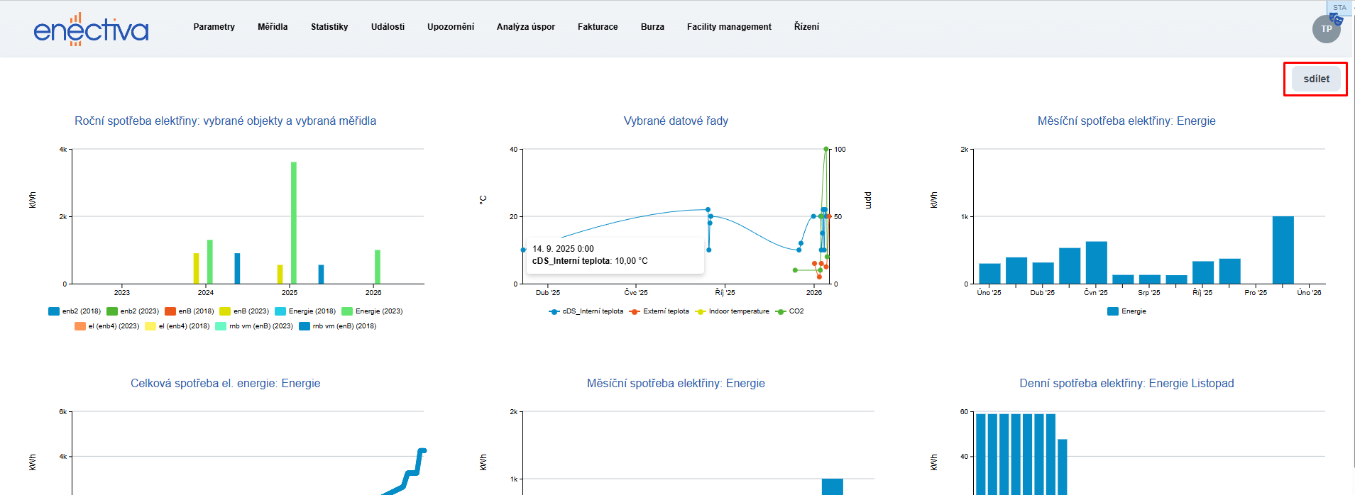 Dashboard umožňuje zobrazit vybrané grafy na úvodní stránce po přihlášení. Sdílený odkaz zobrazí pouze dashboard, bez přístupu do zbytku aplikace.