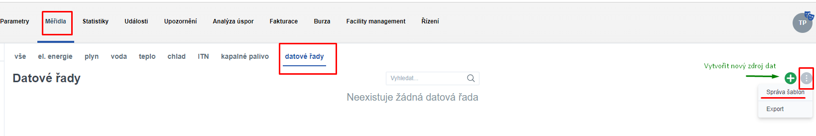 Šablony můžete upravovat nebo vytvářet po kliknutí na záložku Správa šablon v pravém horním rohu v části datových řad vedle položky Vytvořit nový zdroj dat. Šablonu můžete smazat pouze v případě, že pomocí této šablony nejsou vytvořeny žádné datové řady.