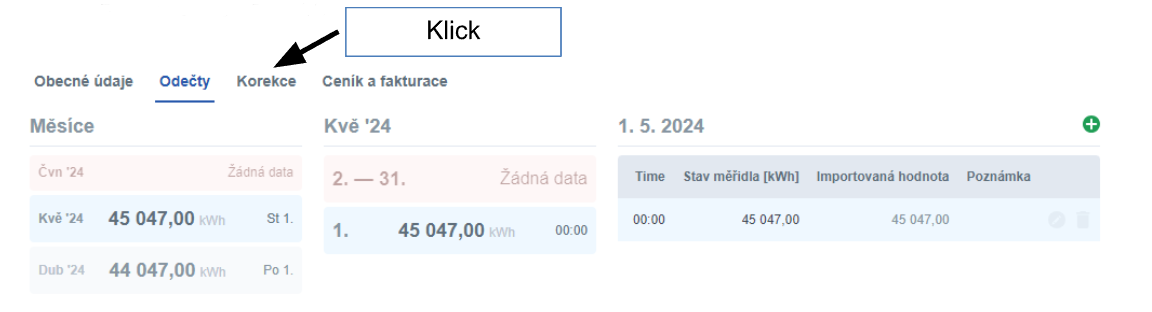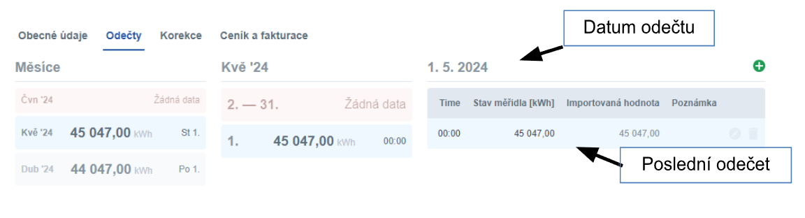 - V záložce „Odečty“ vidíme poslední odečet, který máme u tohoto měřidla (45047 kWh k 01.05.2024).