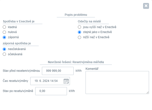 - V "Popisu problému" nic nezměníme, všechno zůstává, jak je. Nás zajímá informace v "Navržené řešení: Reset/výměna měřidla" a zadáme tam informace z protokolu o výměně měřidla: