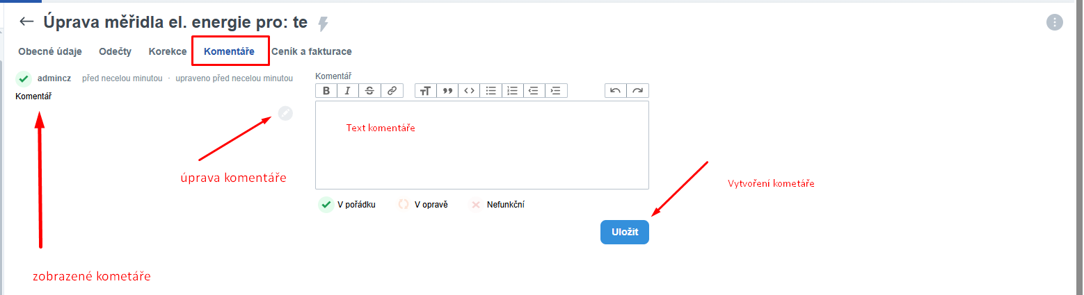 stavem měřidla. Uživatel může upravovat pouze své vlastní komentáře. Komentáře není možné mazat.