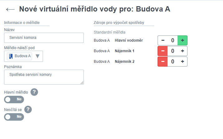 Příklad: Řekněme, že máme vodoměr, který měří spotřebu vody celé jedné budovy. V budově má každý nájemník svůj vlastní vodoměr. V budově se také nachází servisní komora, která je bez vodoměru. Abychom měřili spotřebu servisní komory, můžeme jednoduše vytvořit virtuální vodoměr. Na úrovni budovy (ve stromě objektů zvolte žádanou budovu) a následně na Přidat virtuální měřidlo. Pojmenujte ho “Servisní komora”, následně v tabulce “Zdroje pro výpočet spotřeby vidím všechna standardní měřidla v budově. Výpočet spotřeby virtuálního měřidla můžeme znázornit následujícím výpočtem: