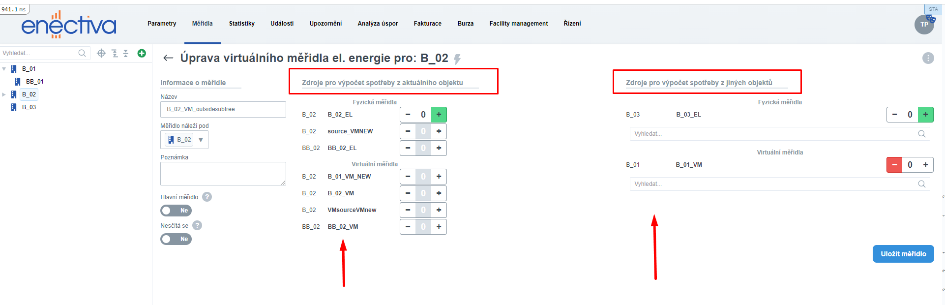- Vytvoříte nové virtuální měřidlo v jedné budově a přidáte mu místní zdroje.