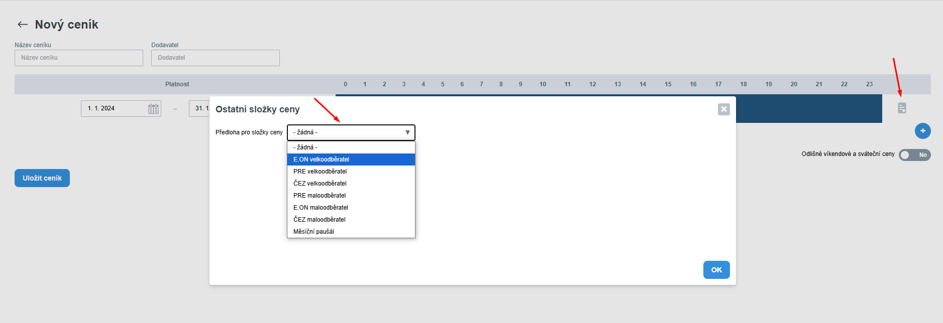 Když vyberete konkrétní energii, objeví se tlačítko Vytvořit nový ceník. Když na něj kliknete, uvidíte podobné okno: