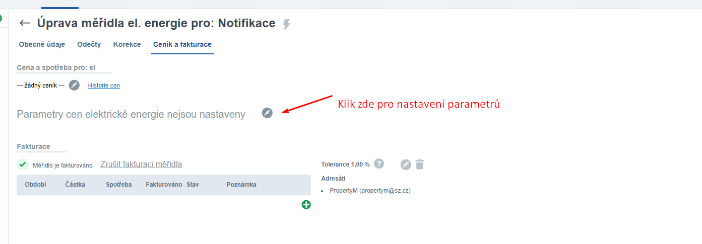 Pro pokročilé ceníky je nutné nastavit parametry danému měřidlu: