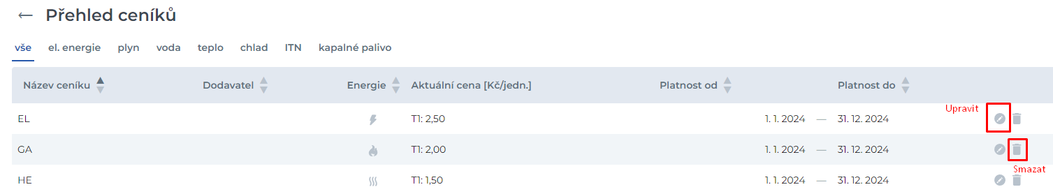 Toto je přehled všech existujících ceníků, které jste kdy vytvořili. Existuje několik záložek: "vše, el. energie, plyn,