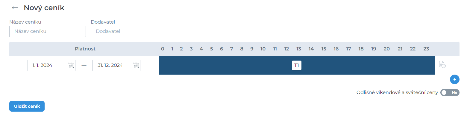rozsah dat je ceník platný, ve výchozím nastavení je nastaven na jeden rok. Následuje časová osa pro cenové tarify (