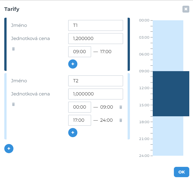 2. vybrat časový rozsah, ve kterém je tarif aktivní. Například můžete nastavit tarif T1 tak, aby byl aktivní pouze během pracovních hodin a druhý tarif T2, aby byl aktivní během zbytku.