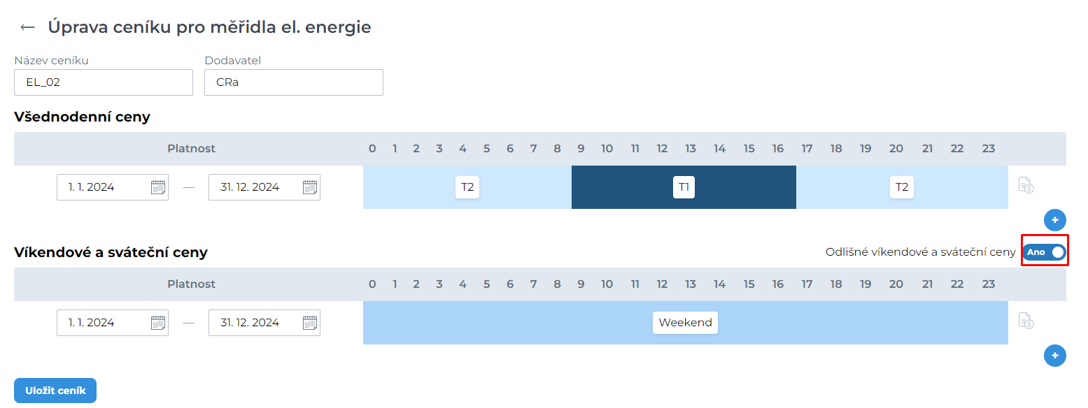 Máte také možnost přidat různé ceny pro víkendy a svátky. To se provádí povolením přepínače na hlavní stránce konkrétního ceníku. Poté je proces nastavení tarifů stejný jako pro běžné ceny v pracovních dnech. Po povolení tohoto nastavení může váš ceník vypadat takto: