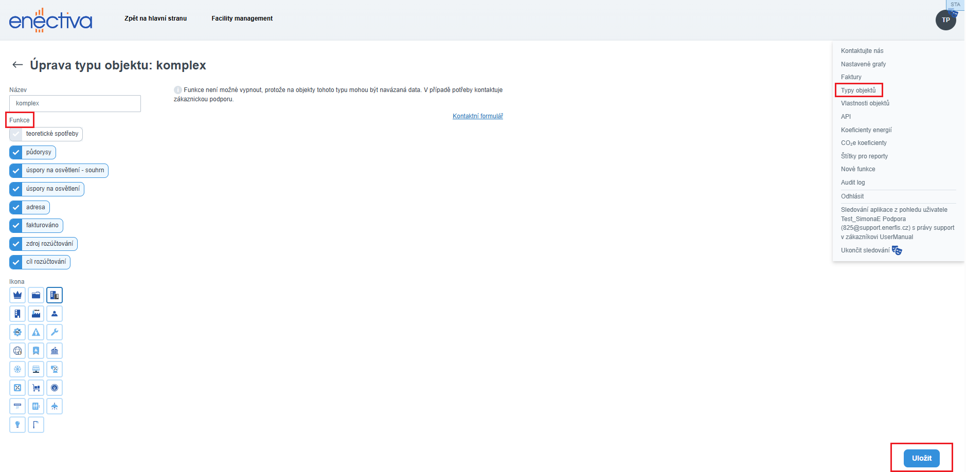 V pravém horním rohu aplikace je možné z rozevíracího seznamu vybrat možnost “Typy objektů”, kde pro vybraný objekt můžete nastavit další funkce. (Kliknutím na požadovaný objekt a zvolit možnost úprav). Takto můžeme objektu povolit dodatečné funkce.
