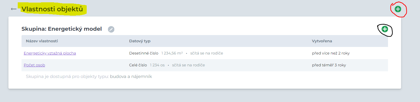 Pokud potřebujete nastavit další vlastnosti např. počet osob v budově (zaměstnanců, nájemců apod.). Musíte nejdříve vytvořit novou “Vlastnost”. V pravém horním rohu aplikace je možné z rozevíracího seznamu vybrat možnost “Vlastnosti objektů”, nebo stáčí vložit odkaz do Enectivy https://app.enectiva.cz/cs/entities/properties.