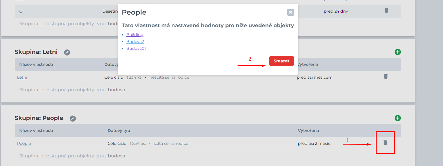 Vlastnost může být smazána, když kliknete na ikonu koše, za následujících podmínek: