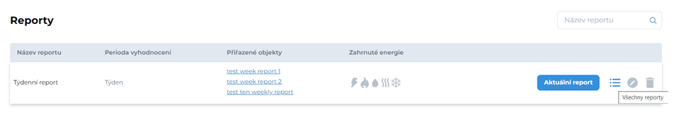 Po kliknutí na tří vodorovně řadky se zobrazí seznam vytvořených reportů. Pak vystačí vybrat potřebný report pro přegenerování a zmáčknout na ikonu “aktualizovat”.