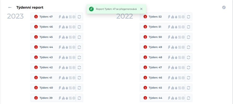 Po změně jakékoliv informací související s reportem, je důležité přegenerovat report pro aktuální zobrazení informací. Přegenerování trvá v závislosti od objemu dat, někdy vystačí počkat jen pár minut.