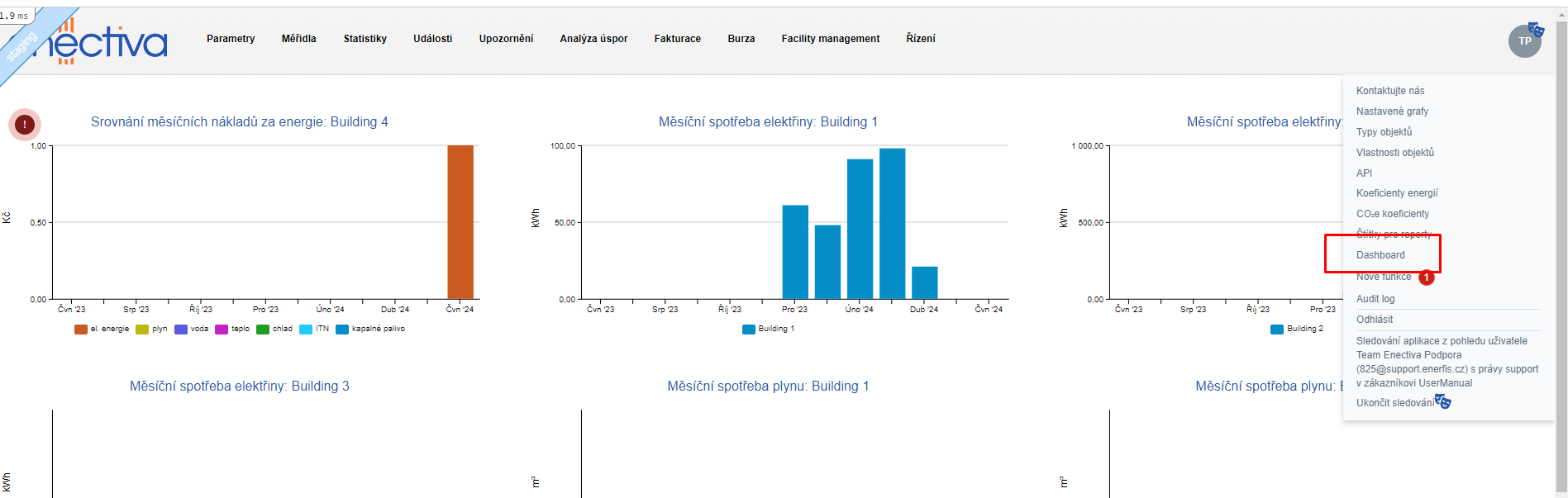 Jakmile je graf uložen, bude automaticky nahrán na váš nový dashboard. Ten je přístupný pomocí tlačítka nabídky v pravém horním rohu po kliknutí na profil uživatele a rovněž ihned po přihlášení do aplikace. Po kliknutí na tlačítko * Dashboard* se zobrazí Dashboard.