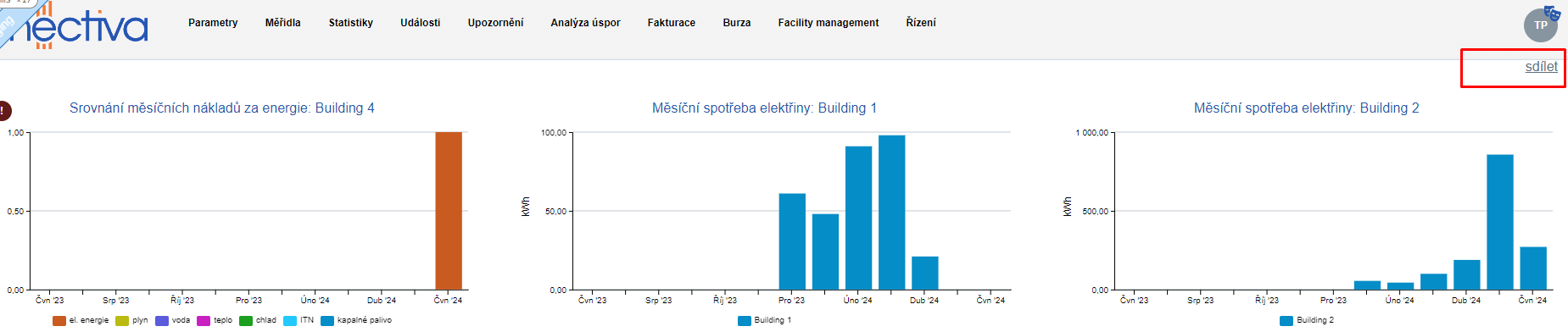 Dashboard také nabízí možnost sdílení, kdy se osobě s odkazem zobrazí pouze samotná stránka dashboardu, takže nemá možnost jakkoli zasahovat do aplikace Enectiva. Pro sdílení stačí kliknout na tlačítko "sdílet", které následně vygeneruje odkaz, který lze zkopírovat do schránky a odeslat kamkoli a komukoliv je třeba.