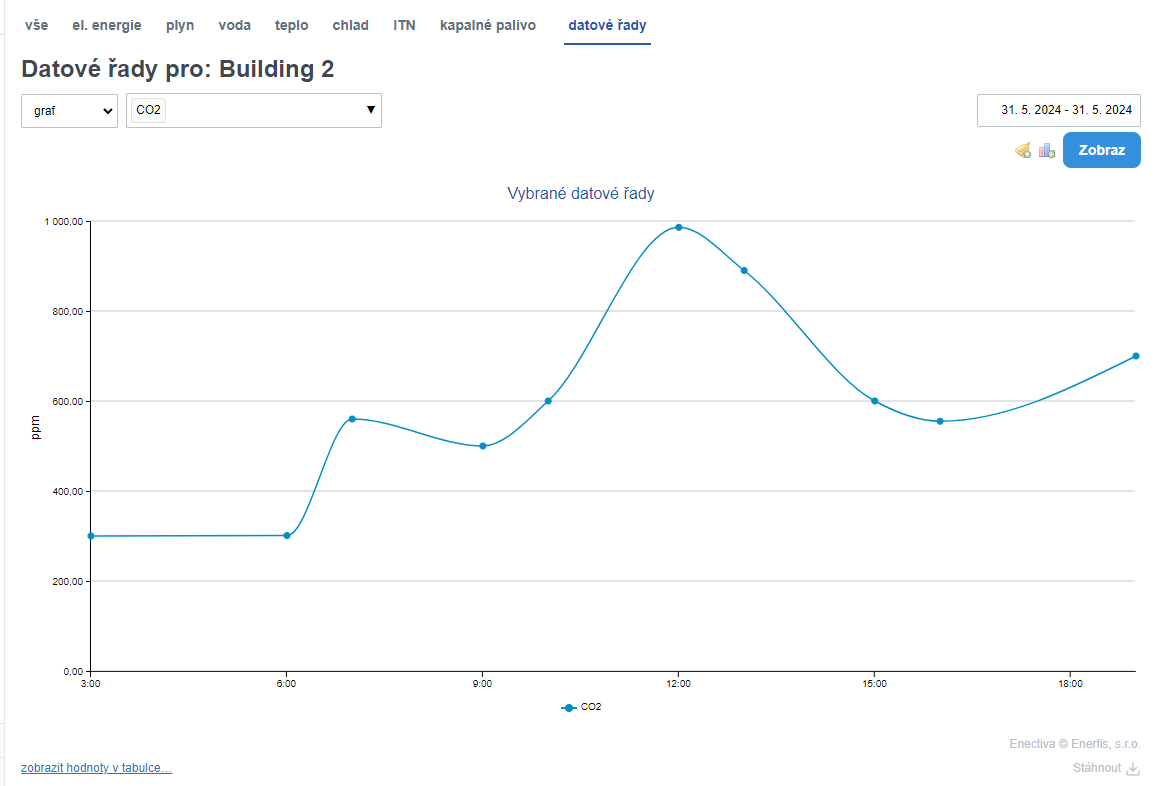 Příklad: Zobrazením denního průběhu koncentrace oxidu uhličitého v místnosti můžeme zjistit, v jakých hodinách během normálního provozního dne dochází ke zvýšení hladiny nad zdravý limit. Denní průběh CO2 si zobrazíte, když si vyberete z nabídky datových řad konkrétní datovou řadu a kliknutím do pole pro časový rozsah a zvolením možnosti konkrétní den.