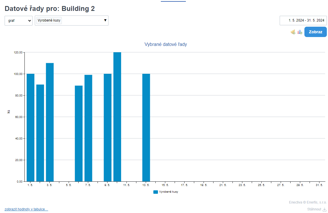 Příklad: Chceme zobrazit počet kusů produktu, který byl vyprodukován od počátku měsíce. Přejdeme proto do Statistiky -> Datové řady a zde vybereme “Vyprodukované kusy” a určíme časový úsek. Zobrazí se nám podobný graf: