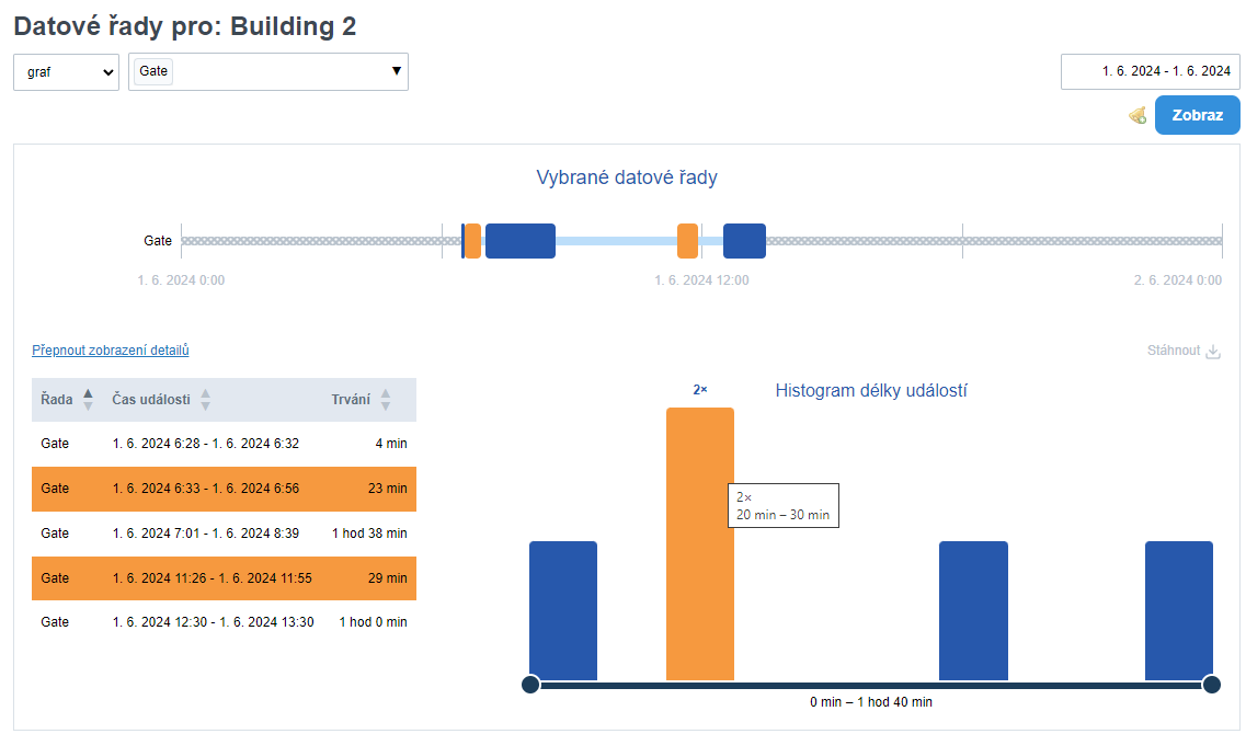 Příklad: Zobrazením binární řady snímající otevřené, nebo zavřené dveře do budovy můžete zjistit, jak často k této události během dne dochází a jak se to může projevit na úniku tepla z budovy, která vede ke zvýšené spotřebě.