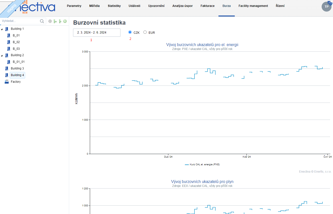 Statistiky burzy se používají ke sledování ceny elektřiny a plynu. Zdroje dat jsou Power Exchange Central Europe (PXE) pro elektřinu a European Energy Exchange (EEX) pro plyn.
