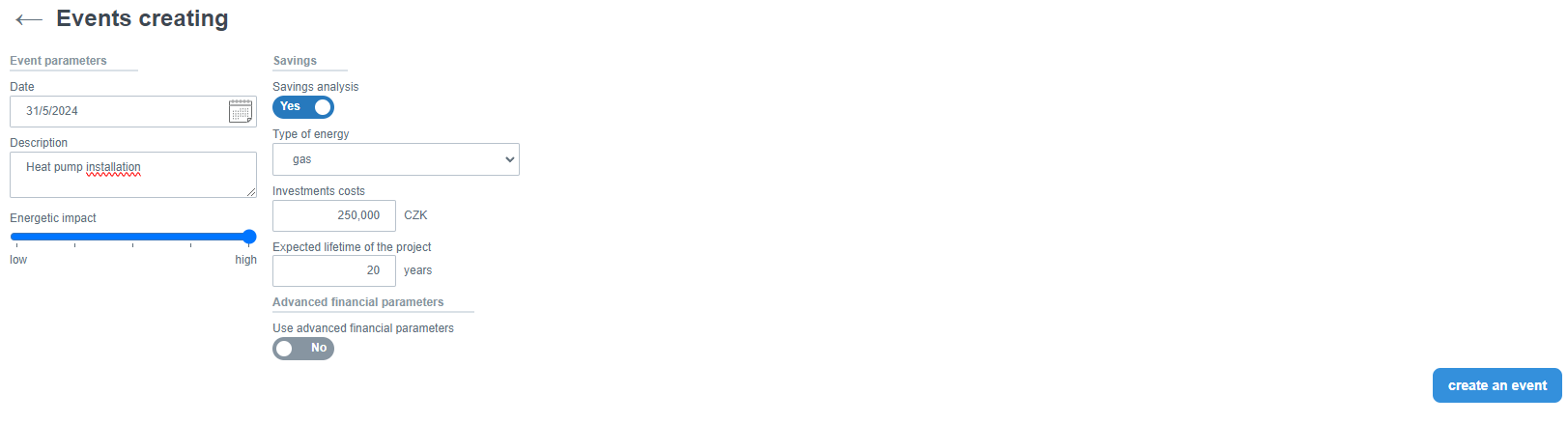 Example: a building has recently been renovated and a heat pump has been installed. In order to track the potential savings on energy consumption on gas consumption, we create a new event. We do this via the Events tab -> Create New Event and then fill out the form.