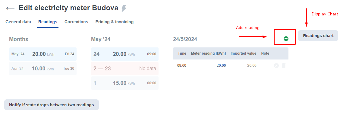 To enter a reading, simply click on the meter and then click on the Readings box, where you can manually enter