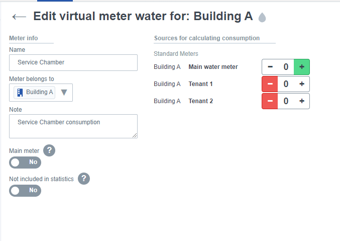 Example: let's say we have a water meter that measures the water consumption of an entire building. Each tenant in the building has their own water meter. There is also a service closet in the building that is without a water meter. In order to measure the consumption of the service chamber, we can simply create a virtual water meter. At the building level (in the building tree, select the desired building) and then click on Add Virtual Meter. Name it "Service Chamber", then in the Consumption Calculation Sources table I see all the standard meters in the building. The calculation of the consumption of the virtual meter can be illustrated by the following calculation: