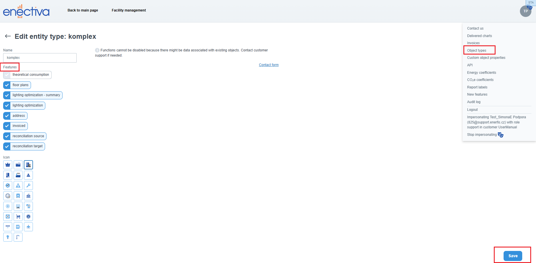 In the top right corner of the application, you can select "Object Types" from the dropdown menu, where you can set additional features for the selected object (by clicking on the desired object and choosing the edit option). This way, we can enable additional features for the object.