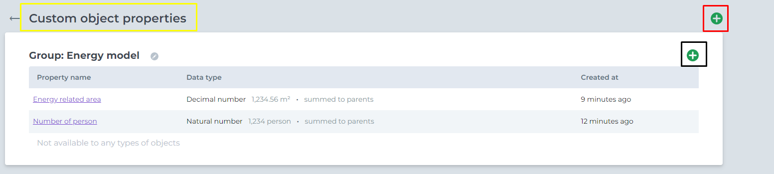 The plus button, highlighted in red, allows you to add a property group. The option to add a property, highlighted in black, is shown in the following image, such as the energy reference area and the number of people.