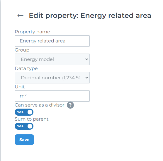 For "Energy related area," as with all properties, you must select the data type from the list and enter the unit. Then save the changes made.