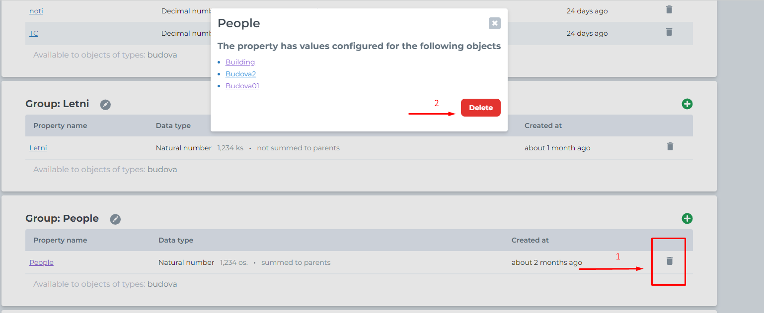 If you need to set additional properties, such as the number of people in the building (employees, tenants, etc.), you must first create a new "Property". In the top right corner of the application, you can select "Custom object properties" from the dropdown menu or use the link to Enectiva: https://app.enectiva.cz/cs/entities/properties.