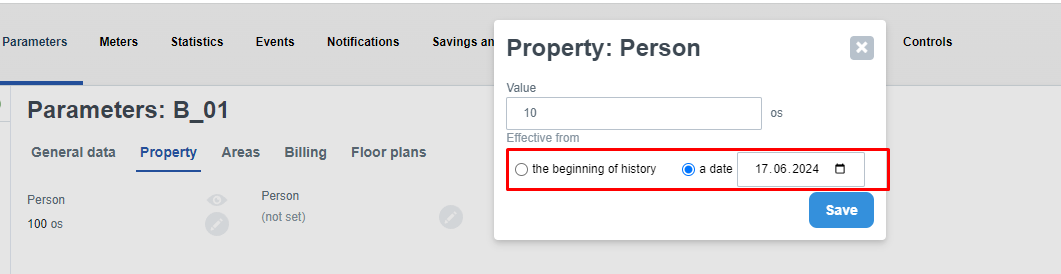 Properties are subject to a change date. This means that any change in the properties must have an assigned date. After filling in the property value, the option to enter a date will appear.
