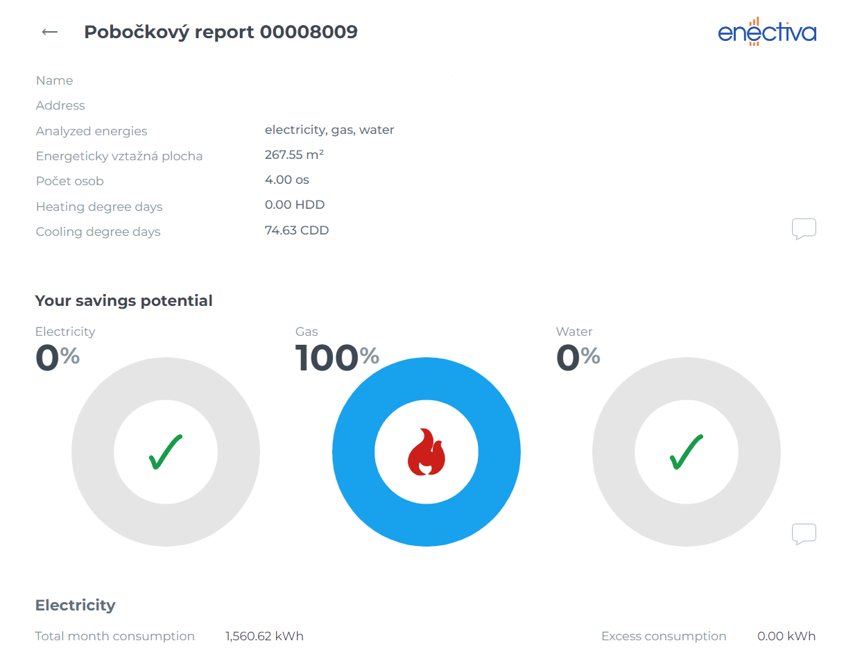 The second energy, gas, has a total potential for savings of 100%. This means that in December you could save 100% of your gas costs if you used as much as the theoretical consumption suggests.