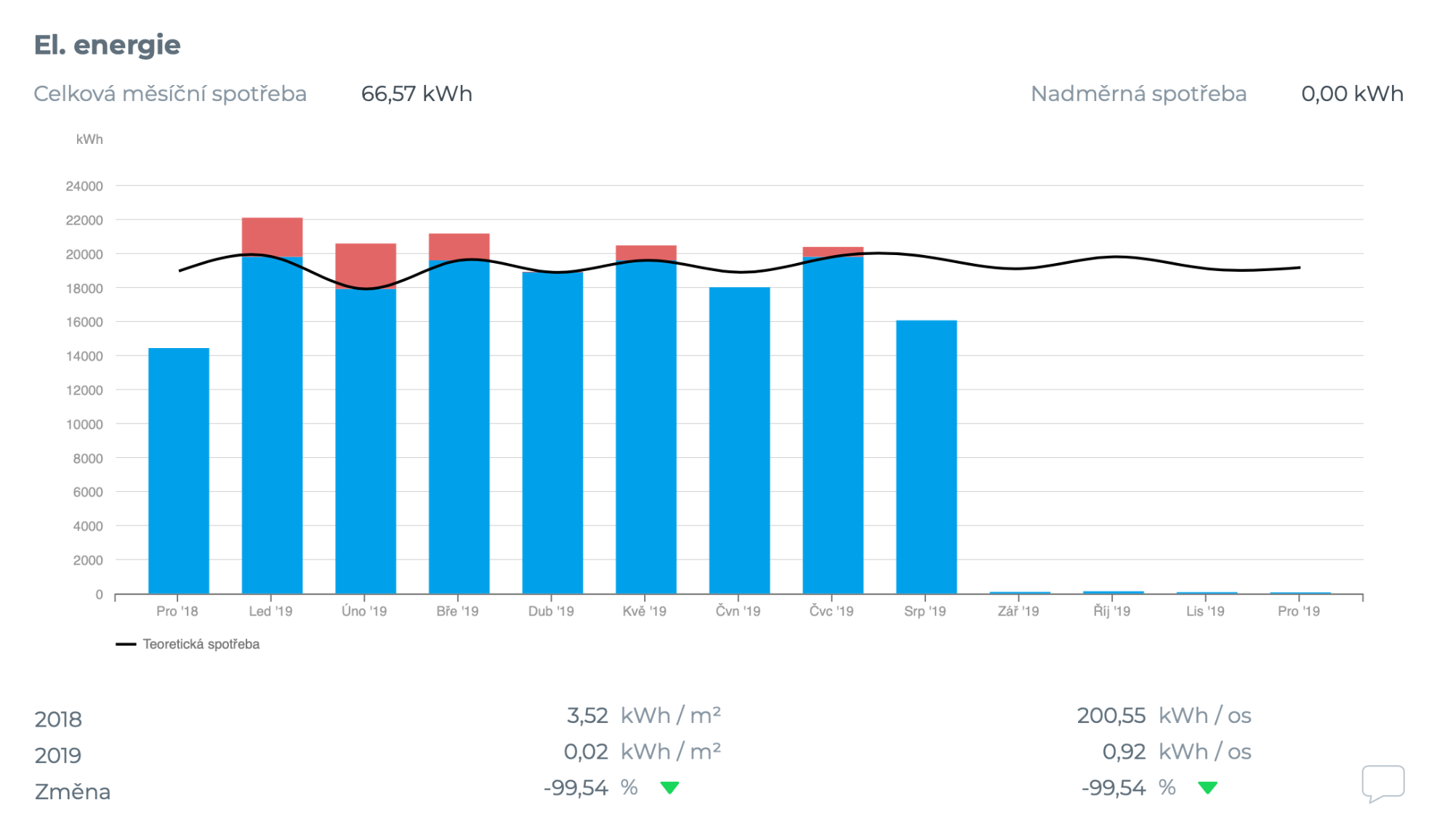 Below the chart is a table that shows the consumption divided by specific parameters. The first two rows show the data for the last two years. The third row shows the change (a positive number with a red arrow symbolises increased consumption). For graphs showing heat (cooling) consumption, the second column is divided by the total number of day-steps (cooling) and the third is divided by the energy reference area. For graphs showing electricity and water consumption, the consumption is divided by the number of persons instead of the number of day-days.