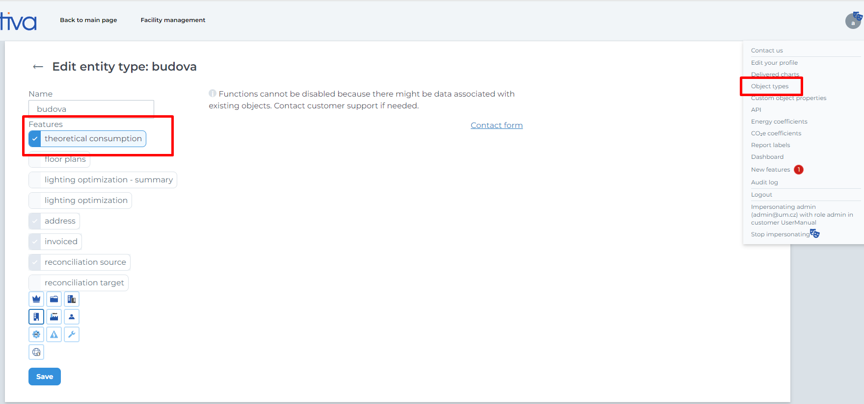 For the theoretical consumption options, the object must have the Theoretical Consumption function set. In the top right corner, select Object Types, choose the desired object, e.g., Building, and click on edit. Select the Theoretical Consumption function and save.