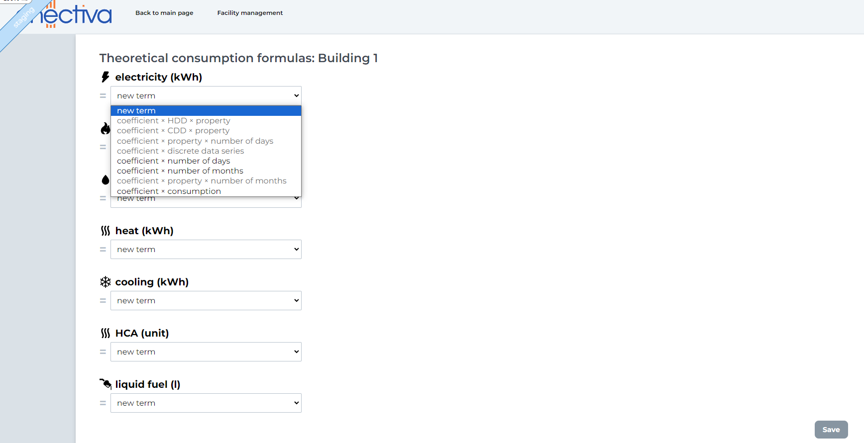 - Each row represents one type of energy - Each line represents one type of energy - after clicking on New term, it is possible to select the desired formula for calculating the theoretical consumption.