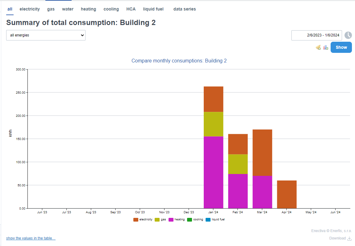 This chart is a simple representation of energy consumption using bar charts. It makes it easy to compare individual energies with precise data. The meters belonging to the displayed entity are taken as the source of the individual energy consumption.