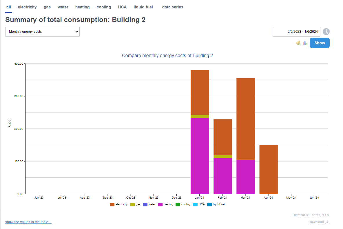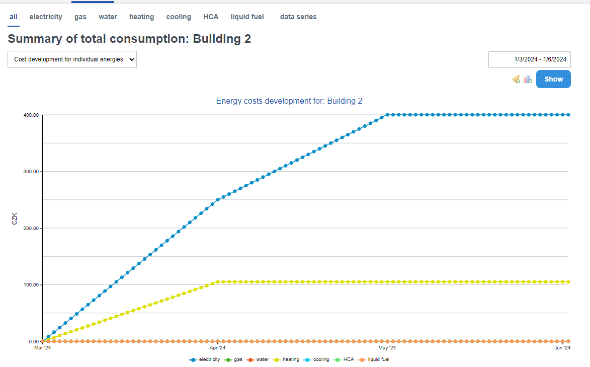 Here you can see how the total cost of each energy increases over the selected period. The biggest advantage of this type of graph is that you can easily see rising costs and immediately analyse fluctuations in the consumption trend.