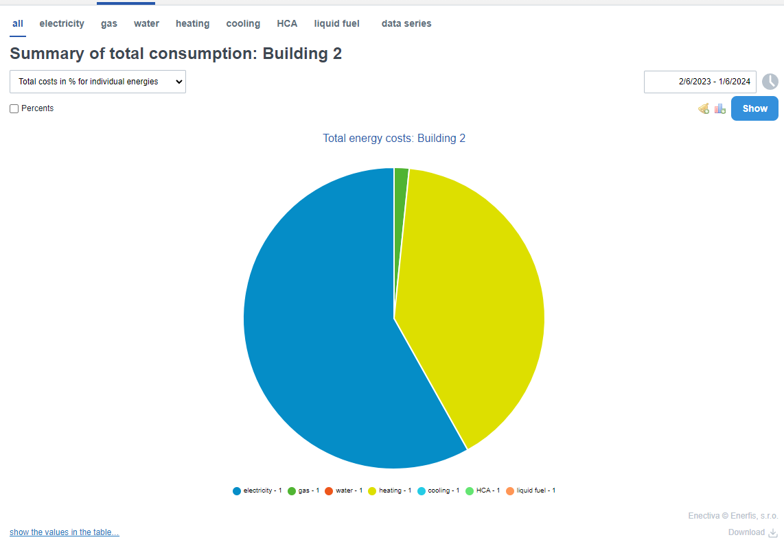 To view total costs in a pie chart, choose this chart type. In it, you will see what energy you paid the most for over the selected period.