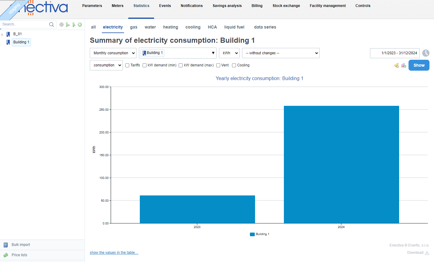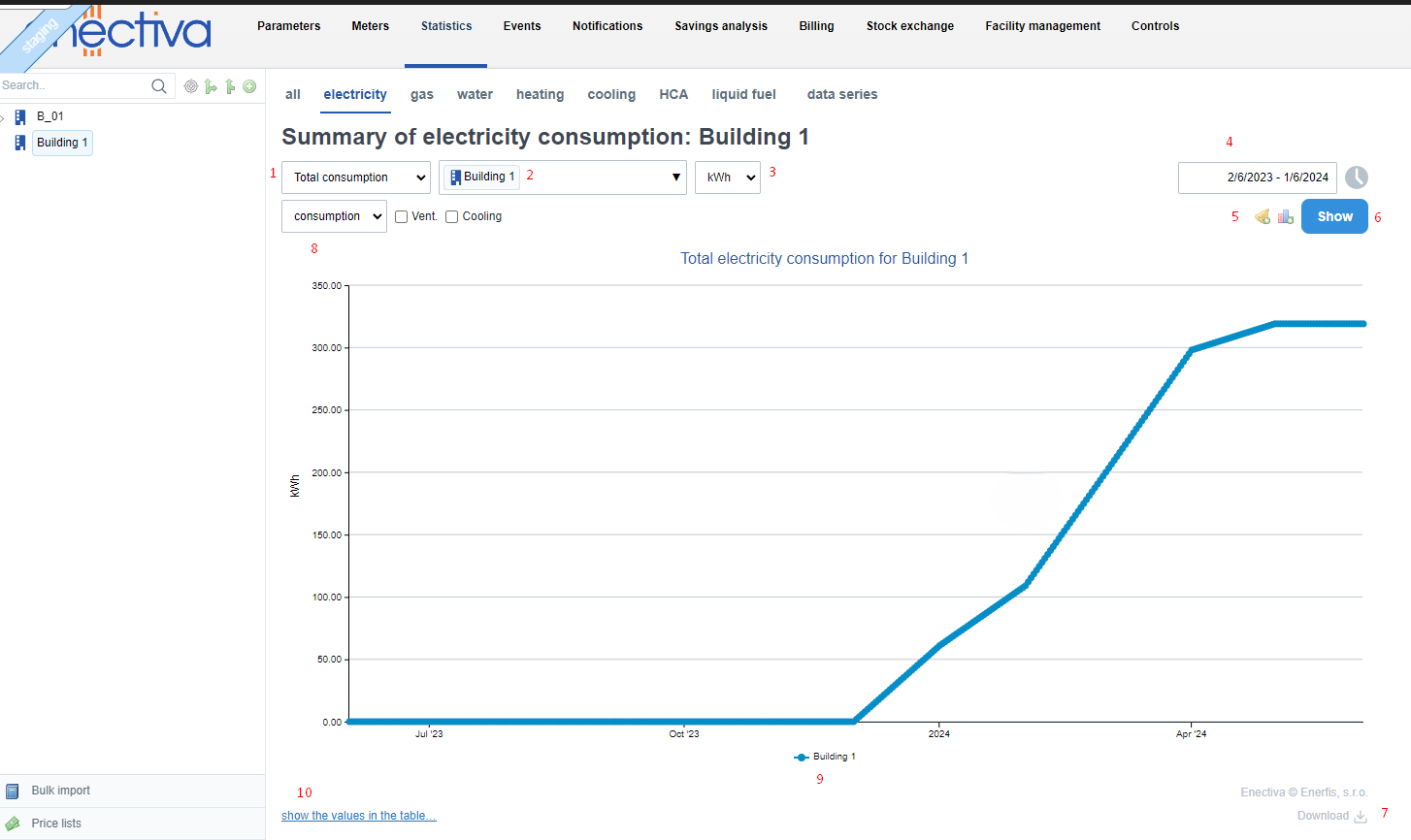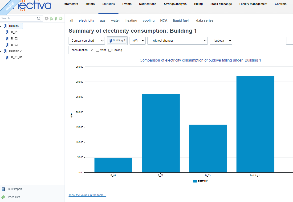 At the building or complex level, you can choose to display the sub-meters that belong hierarchically to the building or complex. In our example, at the building level "BUILDING 1" you can choose to display statistics not only for the building as a whole, but also for individual tenants or meters. You can also display consumption together with data series, for example consumption depending on outdoor temperature or depending on one product produced (in the case of a factory).