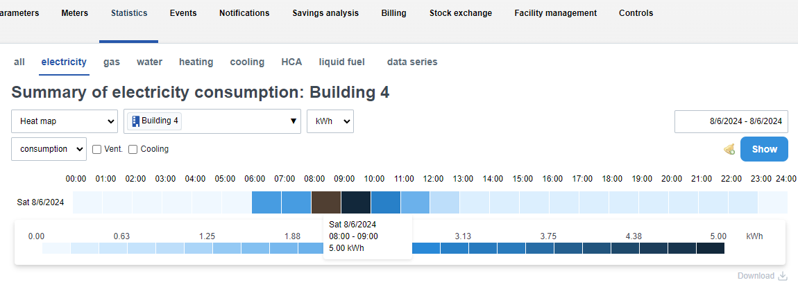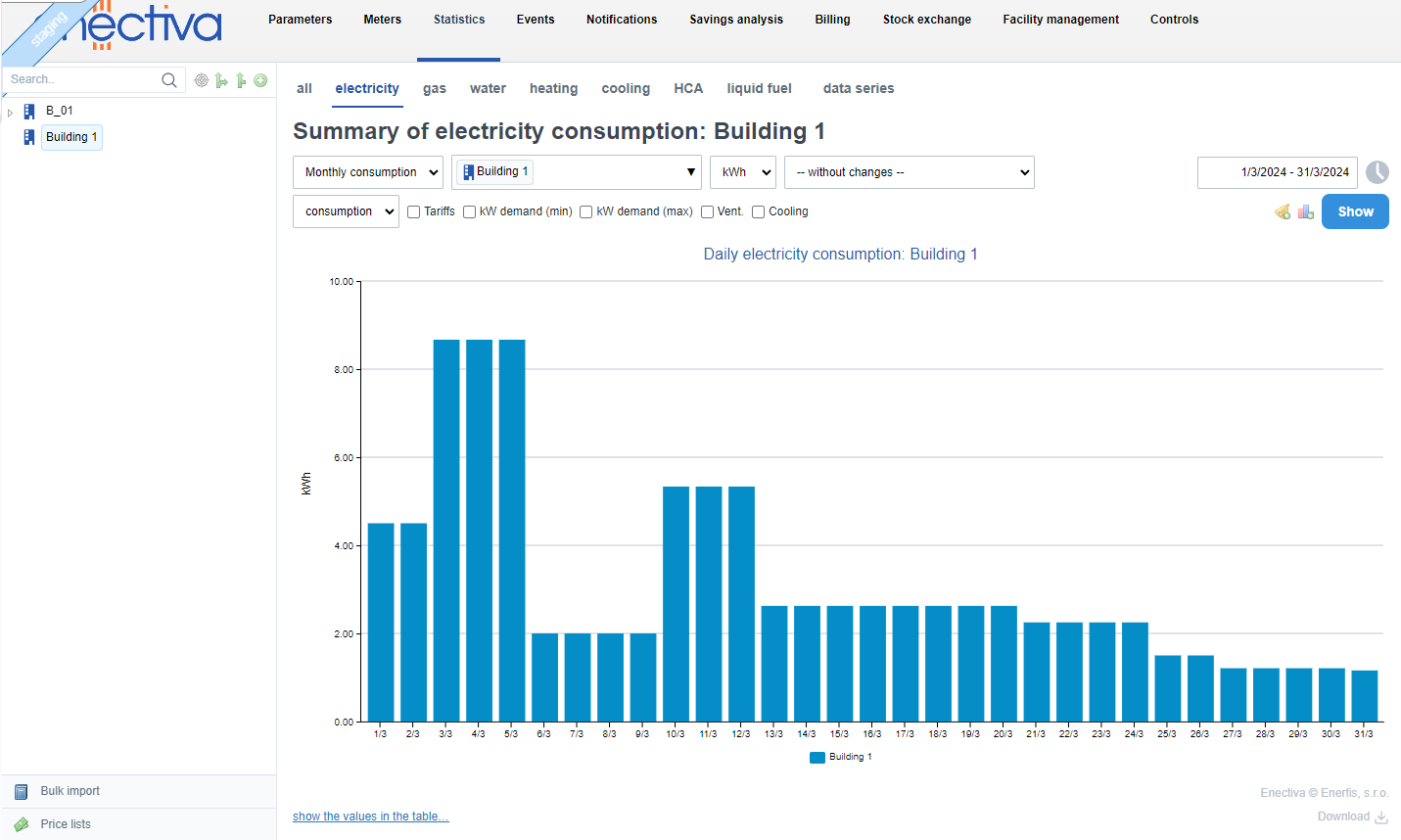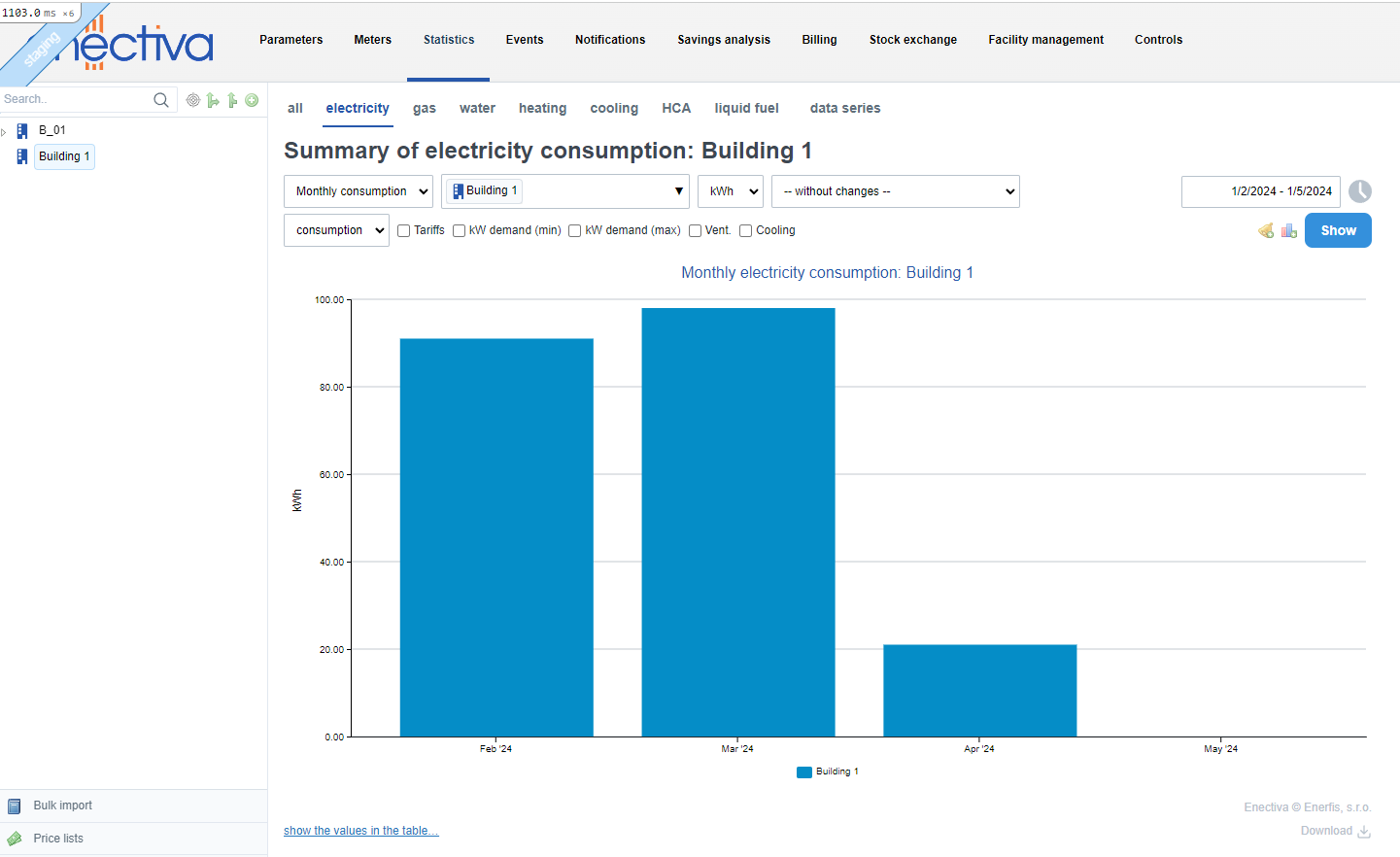 At the building or complex level, you can choose to display the sub-meters that belong hierarchically to the building or complex. In our example, at the building level "BUILDING 1" you can choose to display statistics not only for the building as a whole, but also for individual tenants or meters. You can also display consumption together with data series, for example consumption depending on outdoor temperature or depending on one product produced (in the case of a factory).